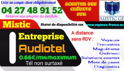 CONSULTEZ MISTIC - consultation téléphone non surtaxé à la minute de 0,53€ à 0,66€ / mn , ou une consultation téléphone de 20 mn ou email à 25€ - ou à domicile chez vous à 50€ les 45 mn plus un forfait de 9,5€ de trajet €